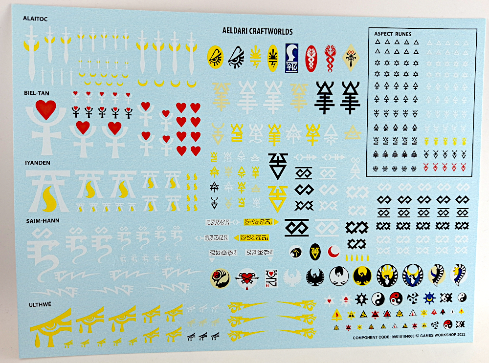 Eldar-Fans (Ja, Eldar. Nix mit Ae und i am Ende. So alt sind die bisherigen Modelle schon.) werden beim Lesen große Augen gemacht haben. Nicht nur bekommt Yriel ein neues Modell aus Plastik, Games Workshop hat sich offenbar auch der Viper angenommen. Entsprechend dieser Auflistung finden wir in der Box jede Menge graue Gussrahmen, die dazugehörigen Bauanleitungen und Bases, zwei Aeldari-Decalbögen und zwei sehr mitgenommene, zerkratze Scheiben für unsere fabrikneue Viper. Wann lernen Hersteller endlich, dass man transparente Teile nicht unter dutzenden Plastikgussrahmen ungeschützt begraben sollte?