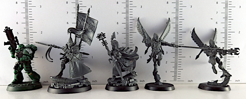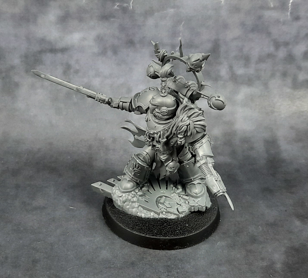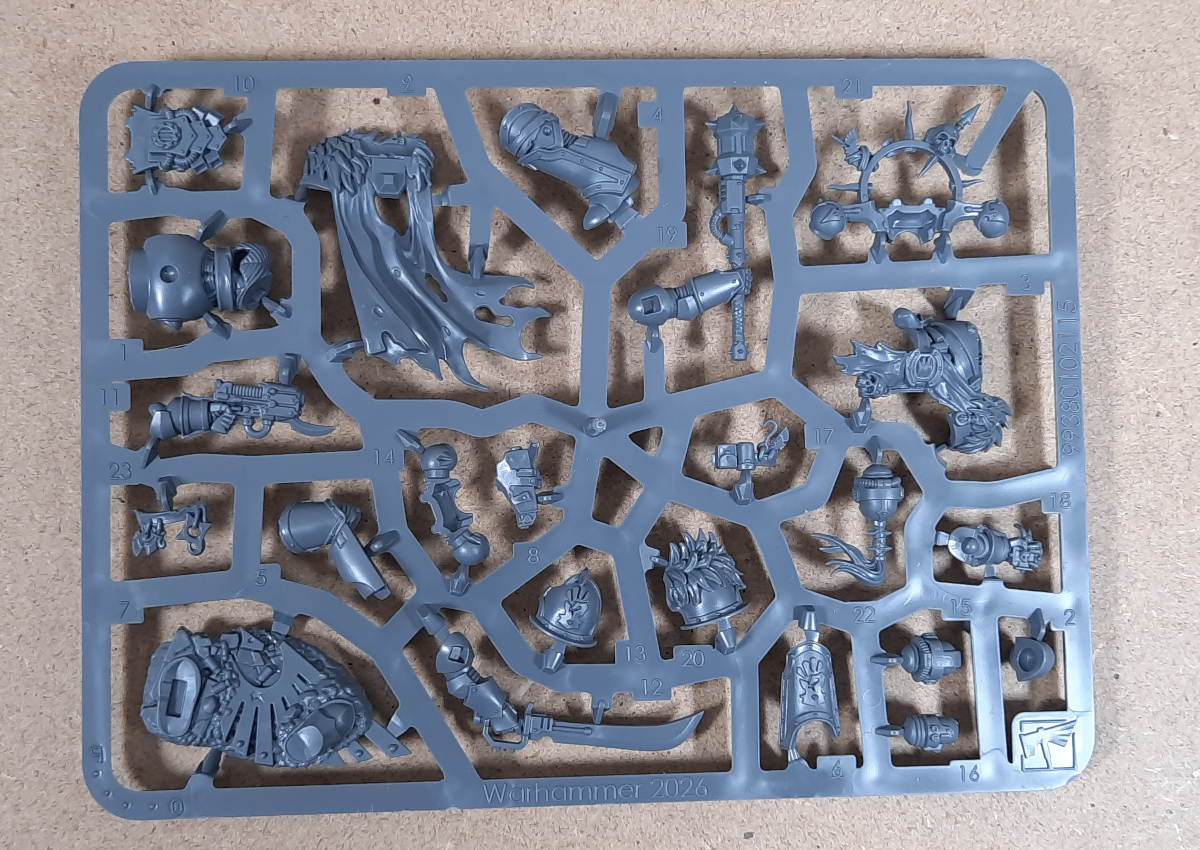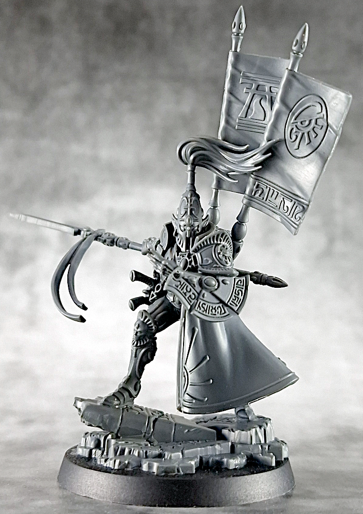 Es ist soweit. Yriel schafft den Sprung vom Metallmodell zu Plastik. Dabei tauscht er den tactical Tyraniden-Kadaver gegen höchst taktische Aeldari-Ruinen. Außerdem kann er dieses Mal auch optional mit Helm gebaut werden. Natürlich sind die beiden modellieren Rückenbanner wieder mit von der Partie. Die Base wächst von ehemals 25 auf nun 40mm. Der Bau geht gut von der Hand, wobei ein paar wirklich sehr kleine Teile dabei sind.