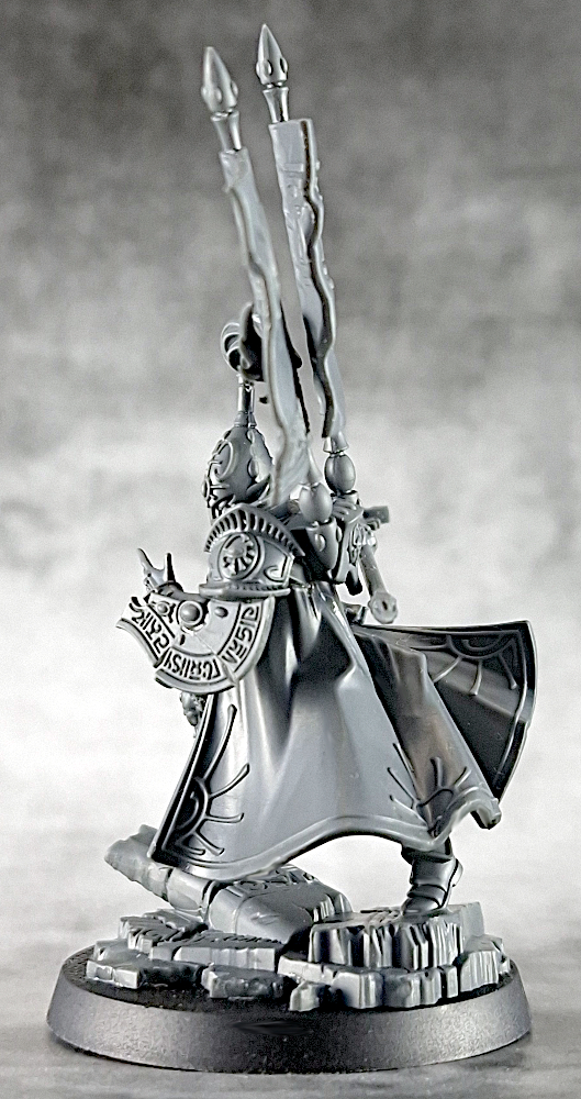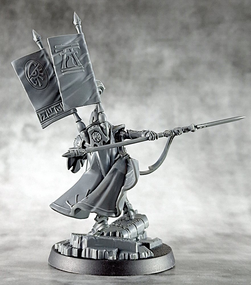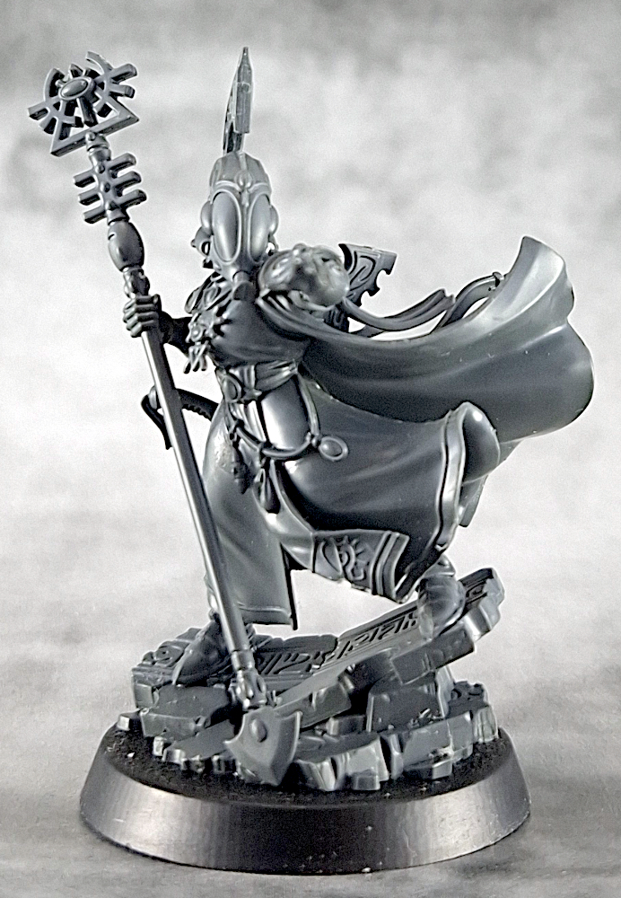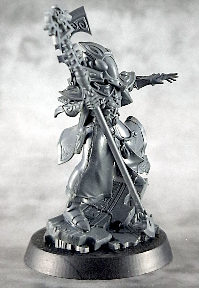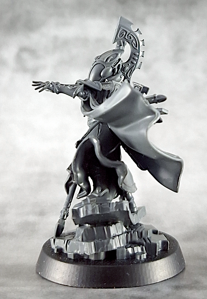 „Allträumer“ Kharseth (Wer hat das bitte übersetzt? „Chief Void Dreamer“ ist die Originalbezeichnung, falls es jemanden interessiert.) kommt ebenfalls in einem einzelnen Gussrahmen und mit einigen Aeldari-Ruinen daher, muss sich aber mit einer 32mm Base zufrieden geben. Auch hier geht der Zusammenbau gut on der Hand. Lediglich die kleinen Rückenfinnen und die beiden wehenden Bänder sind etwas fummelig. Hier gibt es keine Optionen.