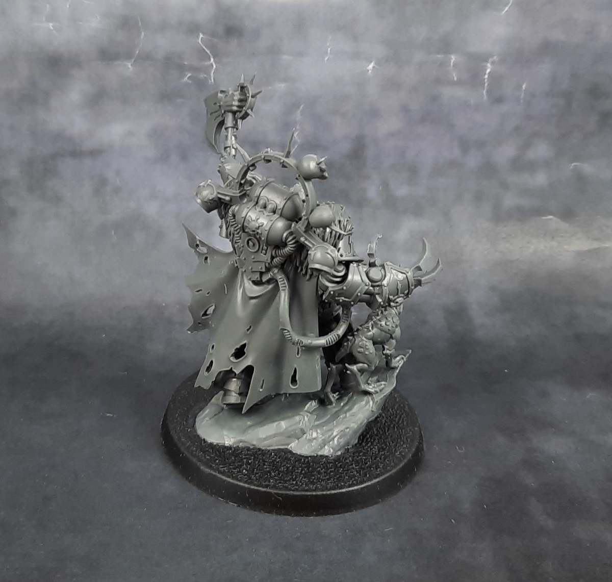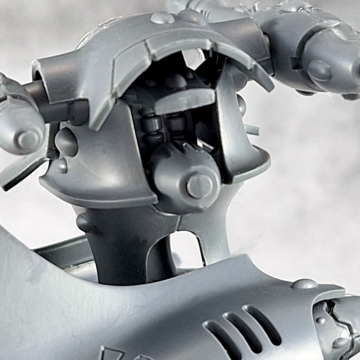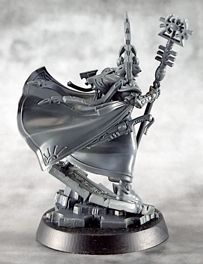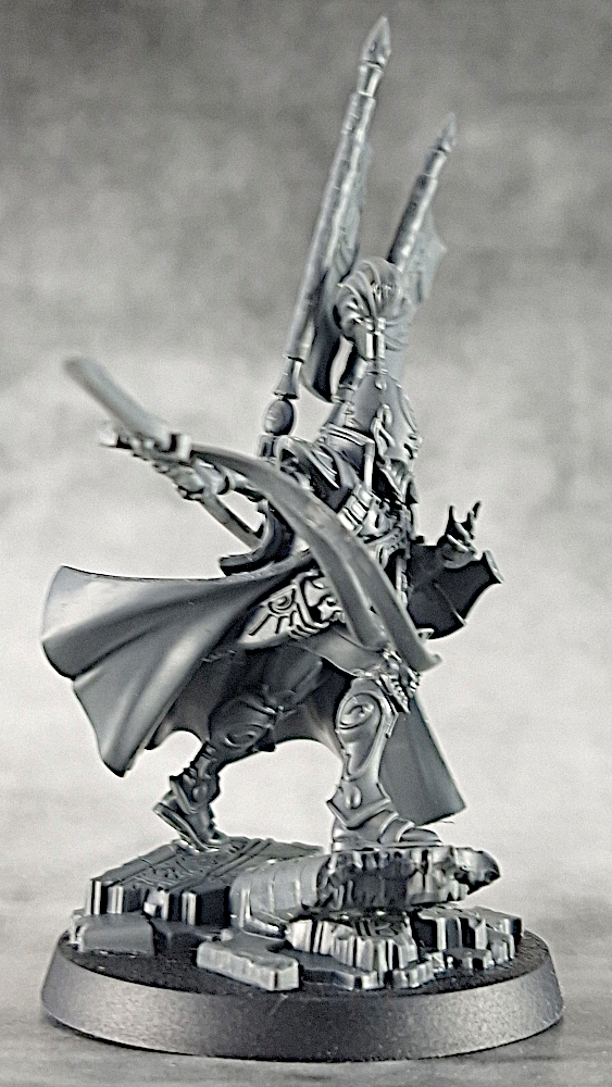 „Allträumer“ Kharseth (Wer hat das bitte übersetzt? „Chief Void Dreamer“ ist die Originalbezeichnung, falls es jemanden interessiert.) kommt ebenfalls in einem einzelnen Gussrahmen und mit einigen Aeldari-Ruinen daher, muss sich aber mit einer 32mm Base zufrieden geben. Auch hier geht der Zusammenbau gut on der Hand. Lediglich die kleinen Rückenfinnen und die beiden wehenden Bänder sind etwas fummelig. Hier gibt es keine Optionen.