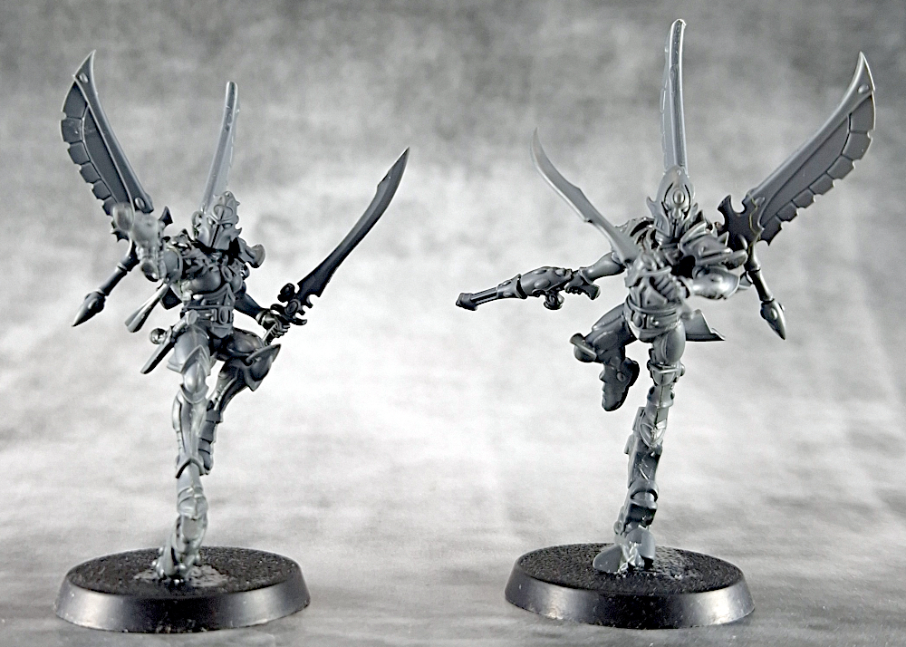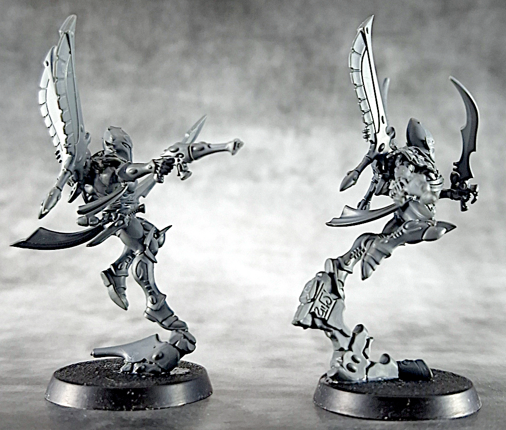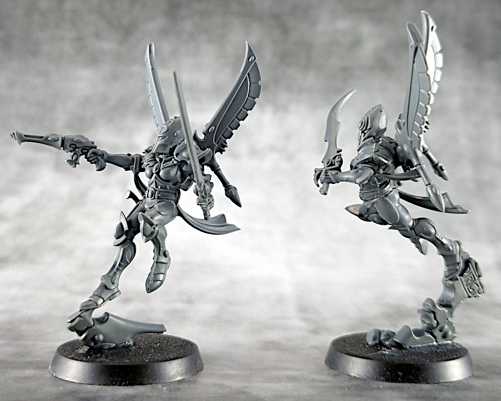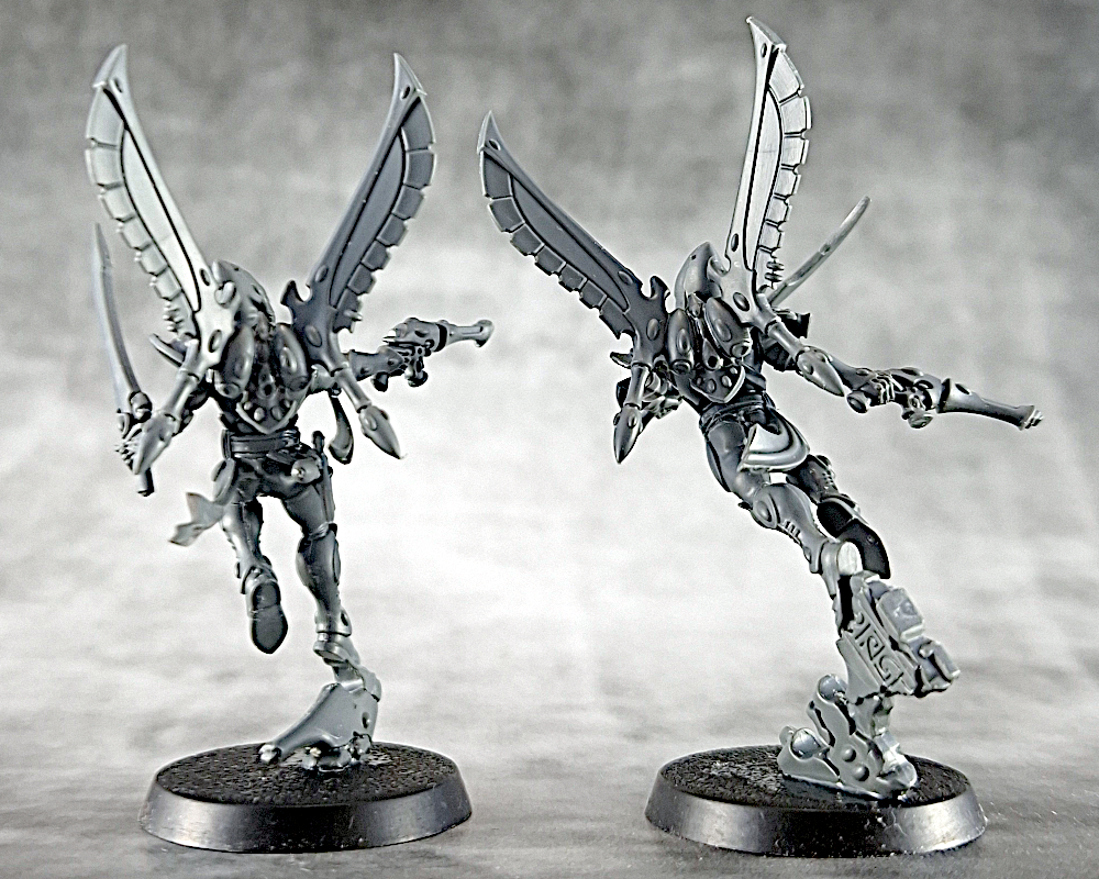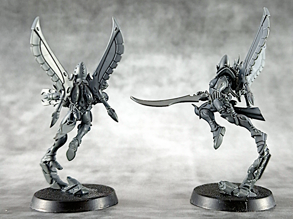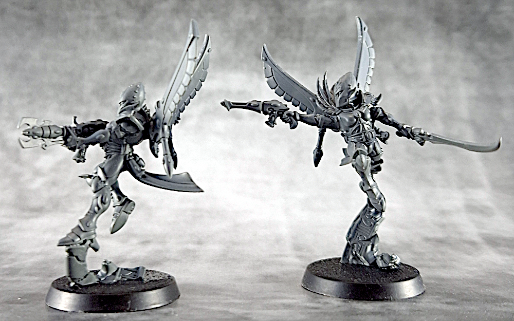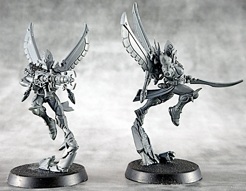 Der Tod von oben der Aeldari-Korsaren bringt pro Gussrahmen insgesamt fünf Modelle mit (es sind zwei Gussrahmen in der Box enthalten) und ähneln in vielerlei Hinsicht den Kriegsfalken was die Posen und die Ausrüstung angeht. Ihre Basisbewaffnung besteht aus Shurikenpistole und Nahkampfwaffe. Für den optionalen Felarch stehen natürlich wieder diverse Pistolen (Shurikenpistole, Fusionspistole, Neurodisruptor oder Überfallhaken) und Schwerter (Schwert oder Kettenschwert) zur Auswahl. Zwei der Modelle können mit je einer von vier beidhändig geführten Spezialwaffen ausgerüstet werden. Zur Auswahl stehen Shredder, Schattenkatapult, Fusionsstrahler und Flammenwerfer. Die Korsaren nutzen also eine Wilde Mischung aus Aeldari, Harlekin und Drukhari Waffen. 15 Köpfe stehen zur Wahl, davon fünf mit Helm. Hat man sich erst einmal entschieden was man überhaupt bauen möchte und mit welcher Bewaffnung sind fünf Himmelsräuber aber auch recht schnell gebaut. Sie stehen auf 28mm Bases.