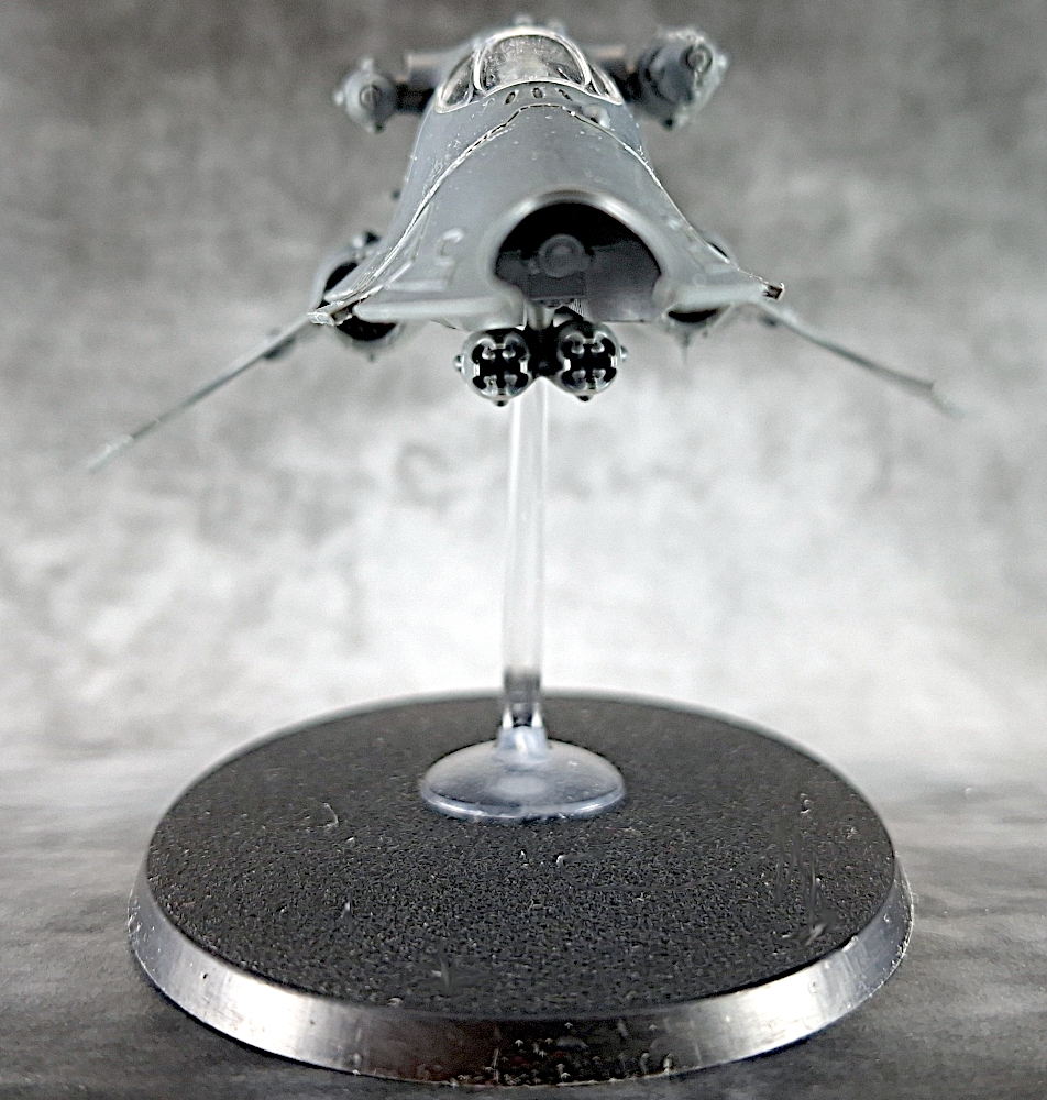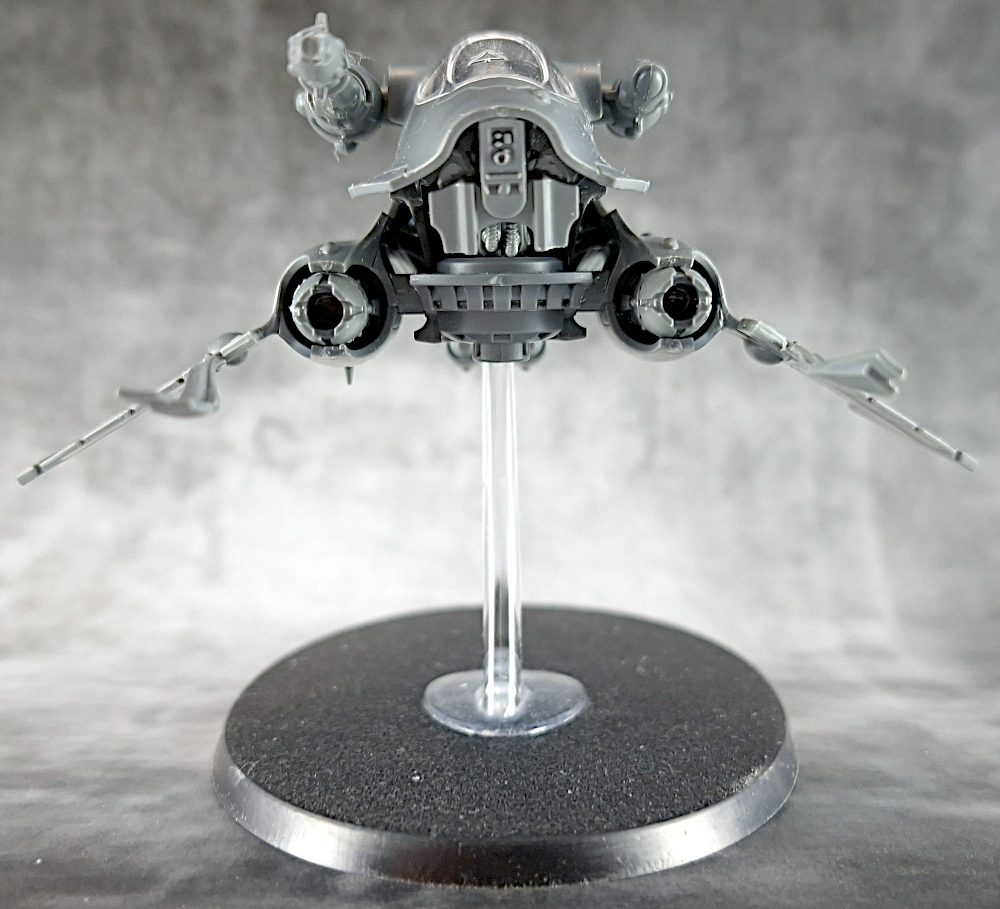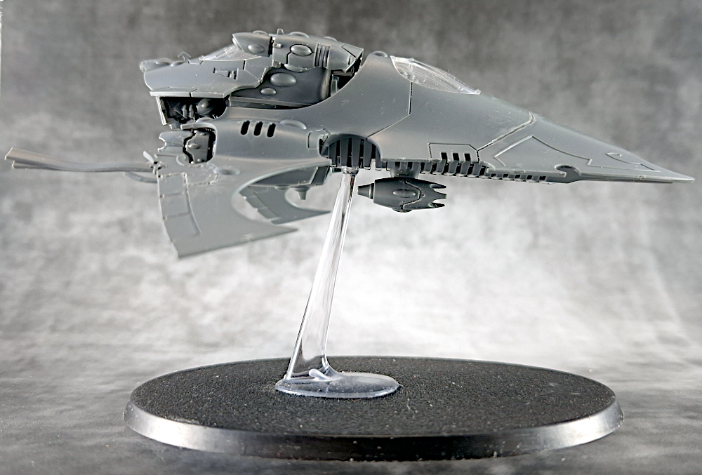 Ein echter Hingucker ist natürlich die neue Viper. Pardon, der Sternenfang. Tatsächlich halten sich die Teile welche für diese Unterscheidung notwendig sind in Grenzen. Da wären zum einen natürlich die beiden Besatzungsmitglieder, die vorderste Verkleidung der Hülle, zwei Flatterbänder an den Flügeln und zu guter Letzt eigentlich nur die komplett unterschiedlichen Waffenoptionen. Eine Shurikenkanone in der Spitze des Fahrzeugs ist immer vorhanden. Der Sternenfang hat bei Turmbewaffnung und zusätzlicher Waffe am Rumpf keine Wahl: Schattenkanone und Sternenfang-Granatwerfer. Weltenschiff Aeldari wählen im Turm zwischen Laserlanze, Impulslaser und Sternenkanone. Unter dem Rumpf montieren sie entweder einen Raketenwerfer oder eine zusätzliche Shurikenkanone. Alle Waffenoptionen sind nicht steckbar und müssten geklebt oder magnetisiert werden. Wobei der Waffenkörper am Turm immer derselbe ist und man quasi nur die Läufe austauscht. Das ganze findet auf einer 105mm Ovalbase platz. Das spannendste (aus unserer Sicht) haben wir uns für den Schluss aufgehoben: Die Turmwaffen können über einen etwas versteckten Kippschalter etwas nach oben geneigt werden. Der Turm selbst kann nicht nur um 360° gedreht werden, in der rückwärtigen Position lässt er sich sogar versenken und verleiht dem Fahrzeug so eine schöne elegante Silhouette. Das Ganze ist zwar nicht die stabilste aller Konstruktionen, aber dennoch gut genug um ab und an besonders dynamische Spielfeldsituationen noch besser in Szene zu setzen.