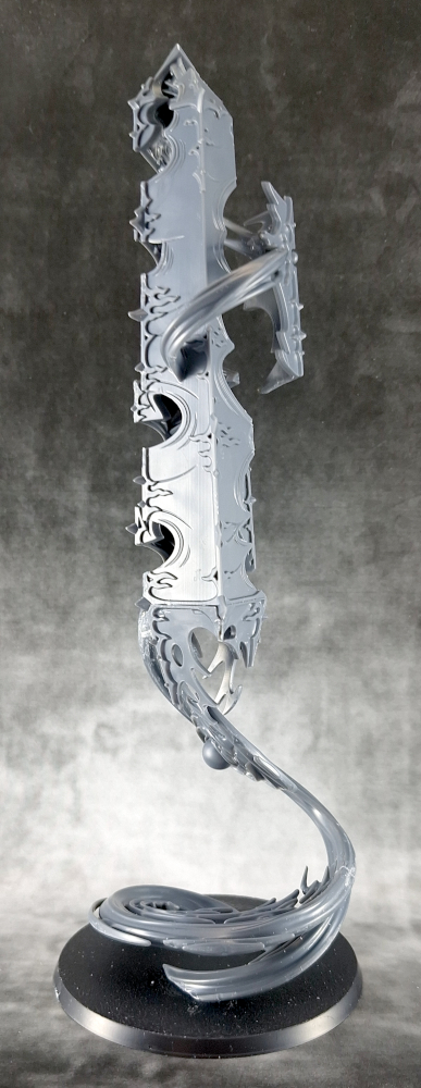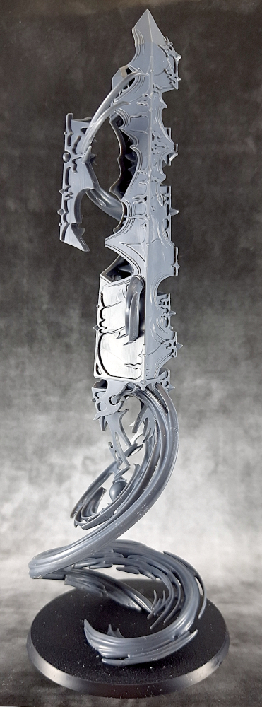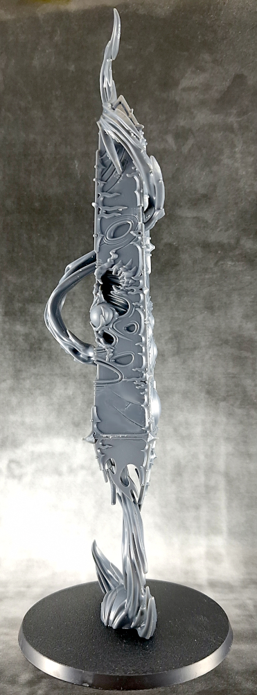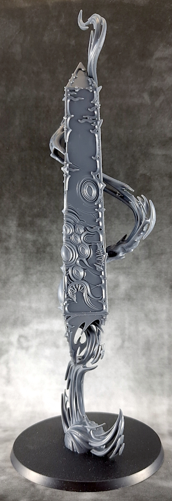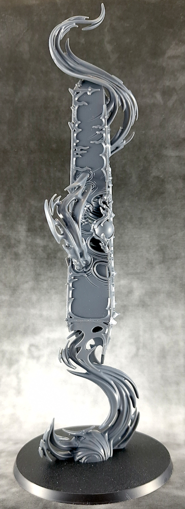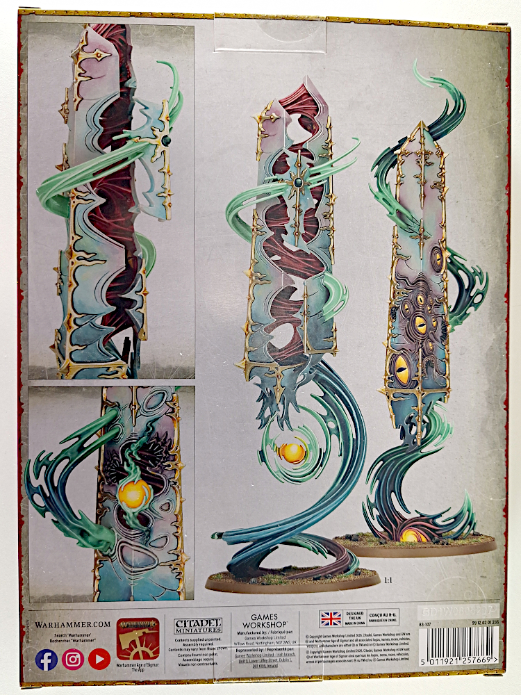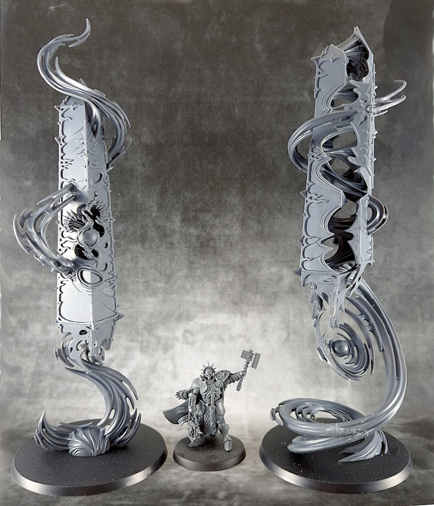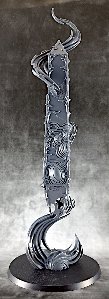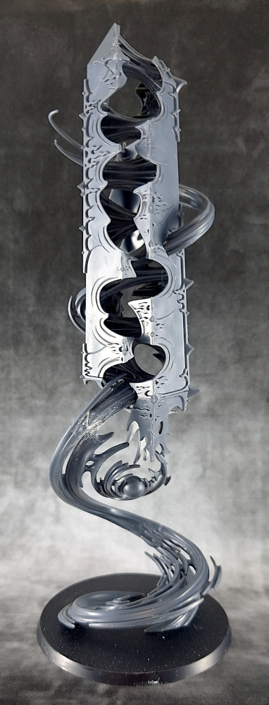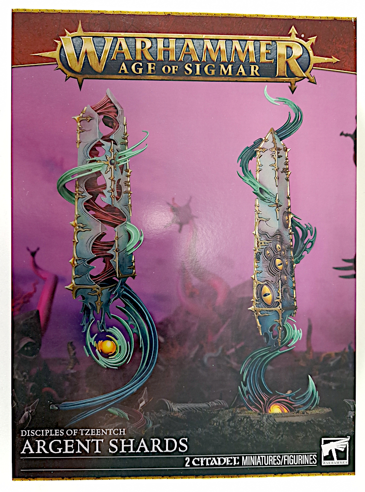 Am Ende des Tages sehen die beiden Silberscherben sehr schick aus und stellen sehr schön das Wesen des Tzeentch dar. Effektiv zwei in der Luft schwebende Obelisken, umgeben von magischen Wirbeln aber auch verdreht von Chaosmagie welche sie mit Augen gesegnet oder die Äußere Hülle aufgebrochen hat um darin irgendwelche organische Masse aufzudecken, die in Fäden gezogen gerade so beide Hälften zusammen hält. Bis auf eine Stelle beim Zusammenbau greifen die Teile gut ineinander, was ein Konstrukt ergibt das zwar ein wenig hin und her wobbelt wenn man es anstupst, aber dennoch stabil genug ist um nicht andauernd umzufallen oder abzubrechen. Da es sich um Fraktionsgelände handelt ist es ein wenig Schade, dass man sich für gewöhnliche Rundbases anstatt einem vollständig gestalteten Sockel entschieden hat. Das kann auch störend wirken oder (je nachdem) die Modelle als potentielle Missionsziele hervorheben (so man sie denn als solche verwenden möchte. Dafür taugen sie sehr gut.). Grundsätzlich passen sie auch gut ins Warhammer 40.000 Universum. Und auf die Sache mit dem Bemalen der „Innereien“ wurde ja schon im Absatz über den Zusammenbau eingegangen. Vielleicht folgt irgendwann ein kleiner Erfahrungsbericht „gebaute Silberscherben bemalen“ als Teil eines Jahresrückblicks.