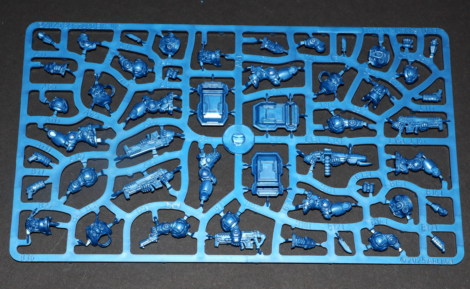 Bei den Terranern beginnen wir mit den ikonischen Marines. Hier nehmen wir uns einen 6-Mann-Trupp vor, der sich ebenfalls auf 2 Gussrahmen verteilt: