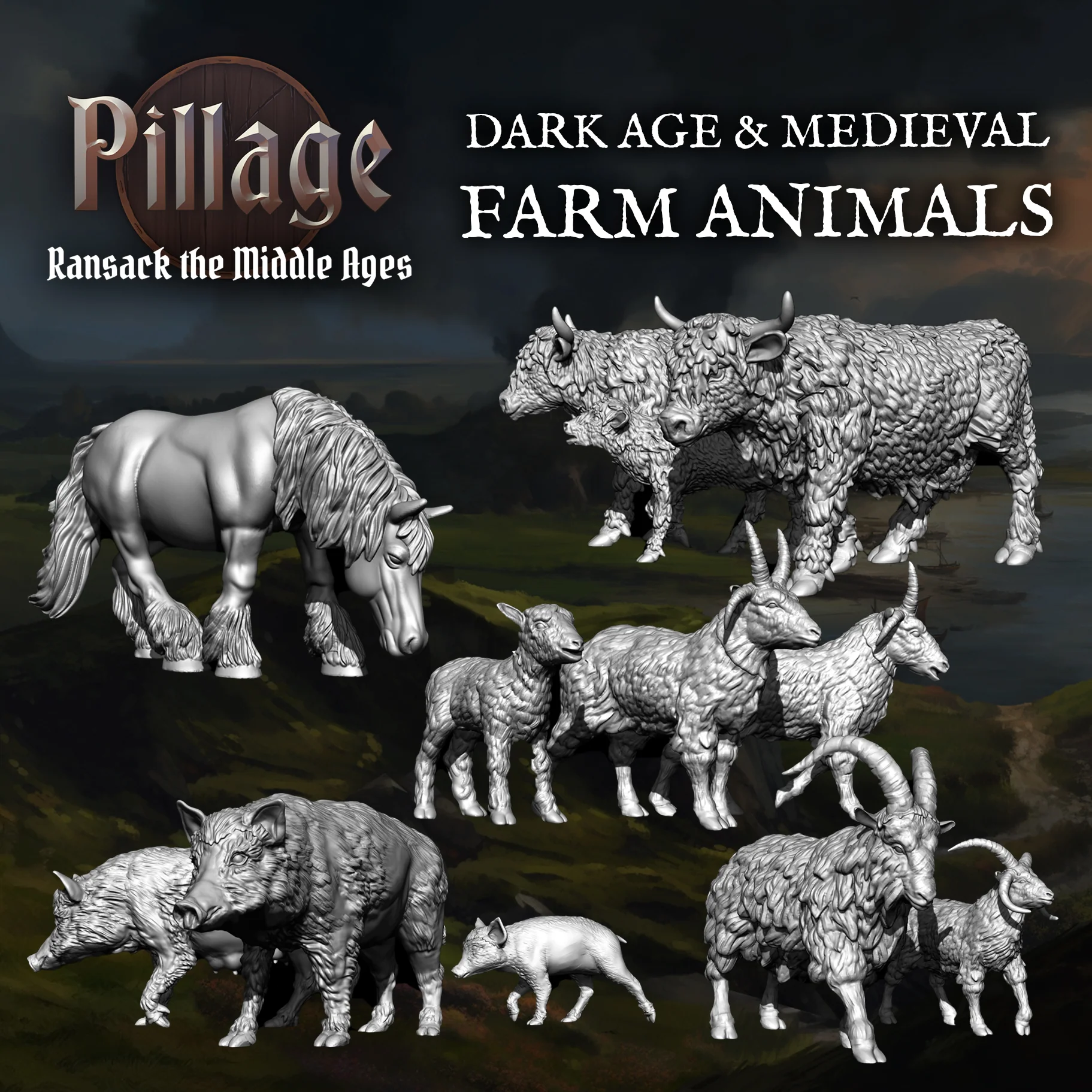 This set contains a huge selection of Dark Age and Medieval farm animals perfect for Pillage scenarios, objectives, or adding life and realism to your tabletop. Ideal as lootable livestock in Pillage or as scenery for any historical or fantasy wargame.What’s included?