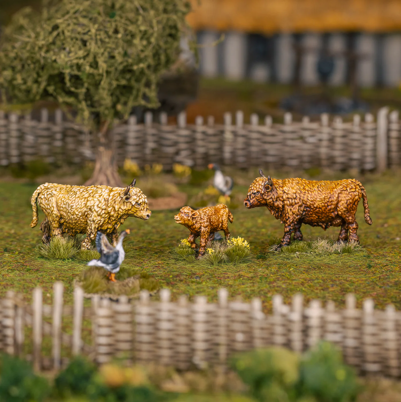 The livestock animals of the Dark Ages and Medieval periods looked quite different to the breeds we have today which have constantly been tampered with to create animals that provide higher yields of meat and milk for farmers. So we had to do quite bit of research into what animals were available in the 8th to 12th centuries and what are the closest references we have available.The sheep breed we chose is the Jacobs sheep. It was introduced to Britain by the Romans. It is a small breed only coming up to the knees on a human. But it was a hardy animal which was well suited to the wet Western European climate. We have some females a lamb and also a ram to keep the sheep happy!The Goat breed is an Old English primitive goat and date back to around 3000BC. It is a small breed but very hardy and suited to cold and rough environments and has spectacular horns.For the Horse we chose a Breton horse breed. Very much akin to the English shire horse in being bulky and full of muscle and very suited to agricultural work.For Cows we went back to the Highland cow for reference which is a close relative of early domesticated cattle. It is short but stocky and very hardy for harsh winters and produces good milk and meat. We created a little family with a Cow, Bull and little lowing calf.
