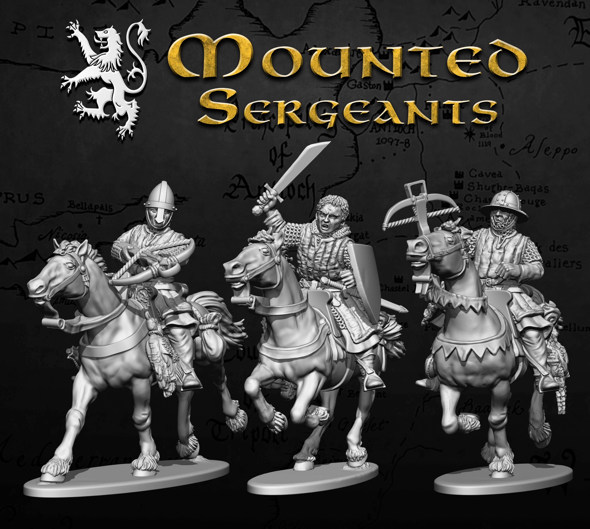 A few weeks ago we showed off some renders of the upcoming Mounted Sergeants set, and we asked you guys what else you’d like to see added to this set. We had some brilliant suggestions and we have added as many as we could!Crossbow arms have been added so you can now field your sergeants as mounted crossbowmen if you wish. There are enough crossbows for every figure and some variety of arm poses can be mixed with all the figures.Pillageable items such as dead rabbits, pheasants and ducks have been added. These can hang from the saddles plus feed bags and leather saddle bags to hang over the horse backs.And of course camp items such bedrolls and bags, as well as medieval water and wine skins called Costrels. 5 different styles that can be hung from the front of back of the saddles or from a belt on the figures. These are fantastic little details and will add some wonderful flavour to your miniatures.Padded gambesons have also been added also so you have a mix or surcoats/gambesons over the chainmail. We didn’t have room for unarmoured bodies so this will have to be a different set.All this as well as a plethora of spears, lances, axes, swords and Falchions make this a great set full of character and a kitbashers dream.