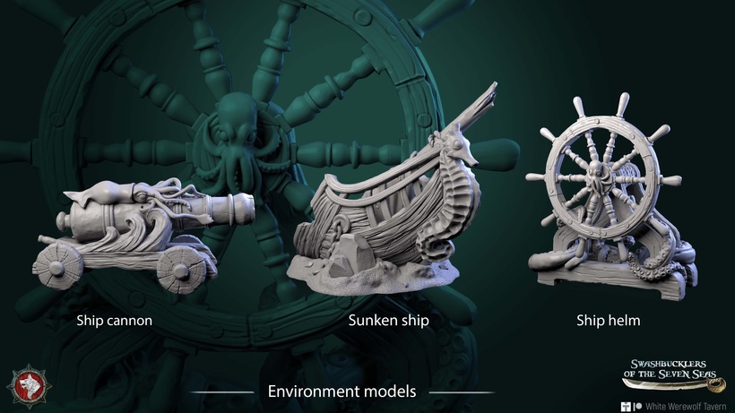 – Ship Helm, Ship Cannon and Sunken ship – 3 individual terrain pieces.